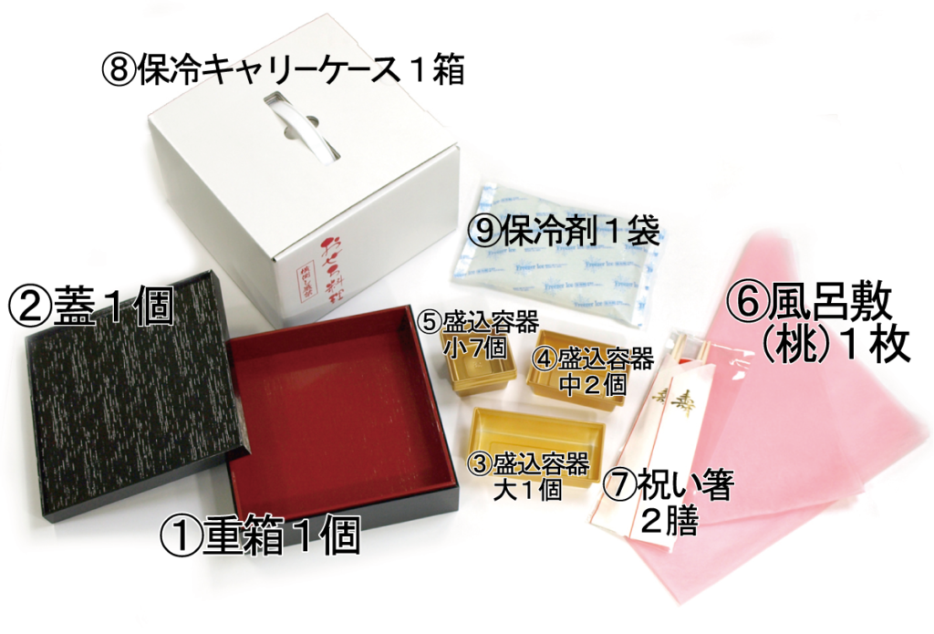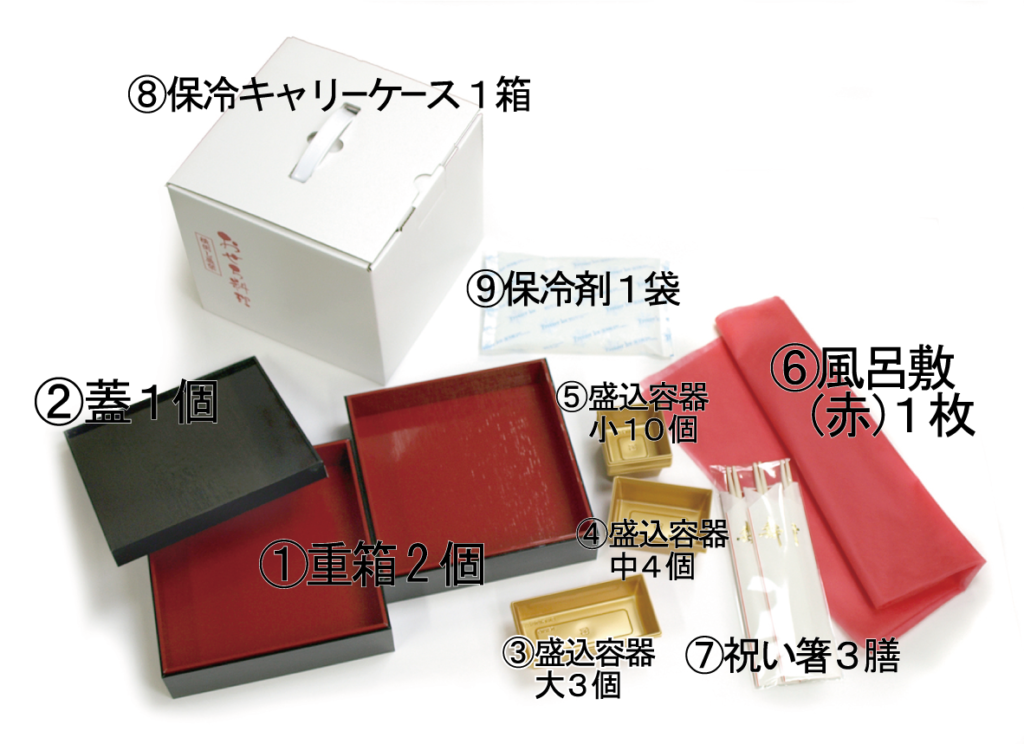 風呂敷・祝い箸・保冷キャリーケース・保冷剤など、お料理以外の必要なものをすべて揃っているので、食材や味にこだわったおせちに専念することができます。