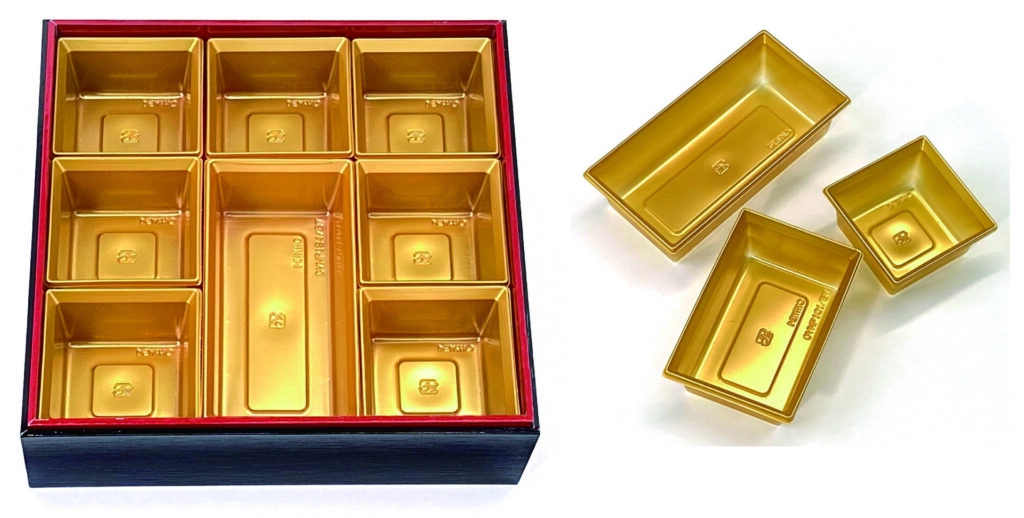 盛り込み容器はプラスティックトレーで食材を引き立てる豪華な金色で3サイズ取り揃えました。画像はお重箱に盛り込み容器・小サイズ7個と大サイズ1個を配置した例です。